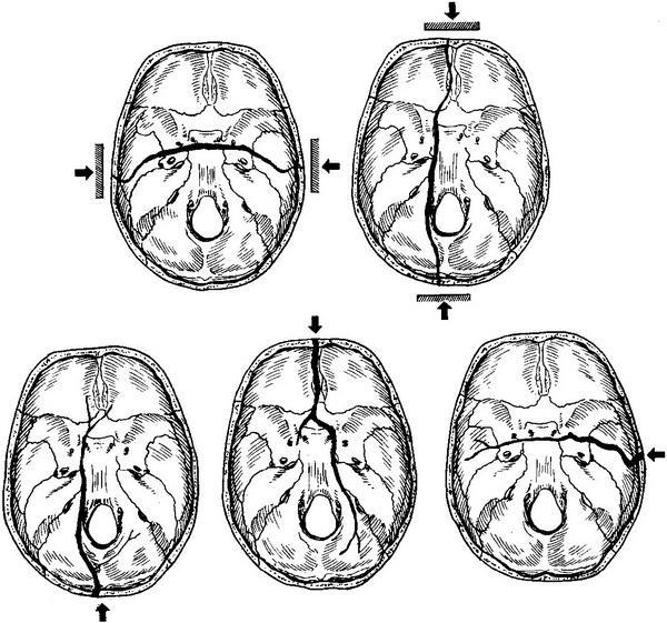 Переломы основания черепа чаще развиваются вследствие непрямой травмы, например, в результате падения с высоты на ноги и таз (в этом случае травматическое воздействие передается через позвоночник) или в результате падения на голову (при этом удар передается с костей свода на кости основания черепа).