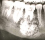 3. Периапикальная цементная дисплазия. Чаще локализуется во фронтальном отделе тела нижней челюсти. Характеризуется появлением множественных патологических очагов, которые не превышают 1 см в диаметре и не распространяются на кортикальную пластинку. В своем развитии опухоль проходит 3 стадии: остеолитическую, кальцифицирующую и зрелую. На рентгенограмме наряду с деструкцией костной ткани выявляют участки повышенной минерализации.