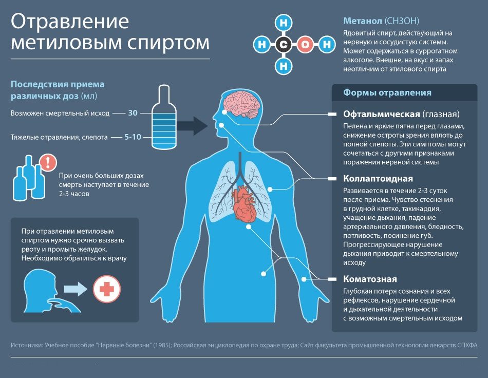 Токсические дозы. Токсическими считают дозы от 30 мл. На токсичность влияет одномоментный прием этанола, при этом токсическая доза может возрастать многократно.