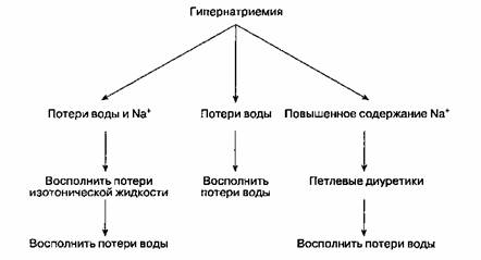 • Недостаточного прибытия Н2О в организм (гипертоническая гипергидратация, представляющая собой насыщение внеклеточного пространства солями с одновременным обезвоживанием клеточного сектора, что нередко выступает в качестве осложнения лечения гипертоническими солевыми растворами);