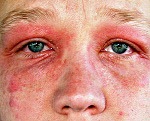 Аллергическое воспаление на лице чаще всего локализуется в области верхних и нижних век вследствие тонкости кожи и ее повышенной чувствительности на этих участках, а также регулярной травматизации при контактах с загрязненными пальцами и химическими веществами, содержащимися в воздухе. Повреждение кожи век проявляется покраснением, шелушением, отечностью и зудом. Нередко воспалительный процесс в области лица возникает в связи с раздражением кожи при контакте с искусственными ногтями или агрессивными веществами, содержащимися в лаке для ногтей. При этом определяются ограниченные участки поражения в области век, углов глаз, за ушами.