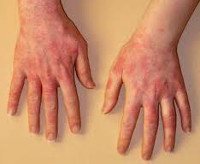 • Аллергический контактный дерматит. Является аллергическим состоянием, развивающимся по принципу реакции гиперчувствительности замедленного типа (ГЗТ). Может провоцироваться как собственно каучуком, так и вспомогательными компонентами перчаток, презервативов либо других изделий. Характеризуется поражением слизистых оболочек или кожи в области соприкосновения с латексными материалами, иногда с вовлечением соседних областей.