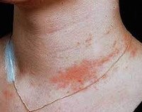 • Физикальный осмотр. При поражении кожных покровов обнаруживается покраснение, эритематозные высыпания, иногда шелушение. Частая локализация - низ живота, запястья, шея, пальцы рук, мочки ушей, подмышечные впадины. Иногда развивается аллергический стоматит - в полости рта выявляются эрозии, изъязвления, отек слизистых оболочек.