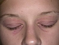 При аллергическом дерматите больные предъявляют жалобы на отечность и гиперемию пальпебральной области. На коже обнаруживается везикулезная, реже буллезная сыпь. Из-за сильной отечности больной часто не может открыть глаза. В уголках глазной щели наблюдается мацерация кожных покровов. При замедленном варианте гиперчувствительности кожа постепенно утолщается и становится более сухой. Далее появляется пятнистая или папуловезыкулезная сыпь. При тяжелом течении аллергического процесса развивается ангионевротический отек окологлазничной зоны (отек Квинке), часто распространяющийся на окружающие ткани: нос, губы, щеки.