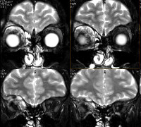В случае васкулита как одного из проявлений псевдотумора орбиты при офтальмоскопии можно выявить застойный диск зрительного нерва. При этом данные визиометрии указывают на снижение остроты зрения. На КТ визуализируются участки повышенной плотности с четким ровным контуром, которые не прилежат к мышечной ткани и зрительному нерву. В случае склеротических изменений ретробульбарная клетчатка имеет вид неоднородной ткани высокой плотности с нечеткими границами и вовлечением в патологический процесс оптического нерва.