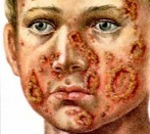 Буллезная йододерма. Достаточно серьезная форма заболевания, которая характеризуется развитием на коже лица или шеи напряженных пузырей диаметром 4 - 12 миллиметров, наполненных серозным или геморрагическим содержимым. Они могут срастаться между собой, формируя бугристые очаги неправильной формы. При дальнейшем развитии буллезной йододермы происходит вскрытие пузырей, на месте которых формируется глубокая язва, в ее центре начинает формироваться плотный узелок, который со временем размягчается и нагнаивается. Заживление таких поражений кожи происходит очень долго и оставляет после себя заметные шрамы.