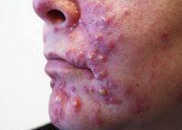 Узловатокистозные угри характеризуются образованием на коже лица, спины и груди многочисленных плотных и глубоких инфильтратов, которые также носят название индуративные угри. При этом воспалительный процесс настолько выражен, что выходит за пределы сальной железы и распространяется на окружающие ее ткани. Индуративные угри могут регрессировать, оставляя после себя рубцы и гиперпигментации. Если процесс идет дальше, то развивается следующая форма узловатокистозных угрей - флегмонозные угри. При этом на месте воспалительного инфильтрата образуется кистозная полость, в которой скапливается гной. Такие угри начинают сливаться и образуют сплошные воспалительные участки. Их разрешение сопровождается рубцеванием и оставляет после себя заметный косметический дефект - рубцы постакне.