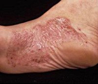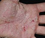 Псориаз ладоней и подошв. Пальмоплантарная разновидность пустулёзного псориаза, поражающего исключительно кожу ладоней и стоп. Первичным элементом является ярко-розовая папула, трансформирующаяся в бляшку, возникающая на фоне гиперемии кожной поверхности, сопровождающаяся зудом и шелушением. Бляшки сливаются между собой, образуя очаги гиперкератоза, иногда часть очагов начинает разрешаться с центра. Поверхность ладоней и стоп теряет эластичность, появляются трещины, присоединяется вторичная инфекция. Диагноз выставляют клинически с гистологическим подтверждением. В процессе лечения применяют наружные антисептики, гормональные мази и ПУВА-терапию.
