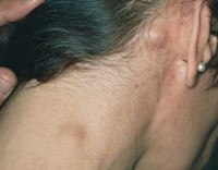 В большинстве случаев первым признаком лимфогранулематоза являются увеличенные безболезненные плотноэластичные лимфатические узлы, которые не спаяны с окружающими тканями и могут образовывать конгломераты. У 70-75% пациенток поражаются шейная и надключичная области, у 15-20% - подмышечная и средостение, у 10% - пах. Позднее всего выявляется поражение медиастинальных лимфоузлов, которые при значительном увеличении сдавливают бронхолегочную ткань, вызывая кашель и затруднение дыхания. Возможно возникновение генерализованного кожного зуда и транзиторной болезненности пораженных лимфоузлов после приема алкоголя.