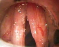 • Непрямая или эндоскопическая ларингоскопия. Ларингоскопическая картина характеризуется диффузным или очаговым, но симметричным утолщением и гиперемией слизистых оболочек структур гортани. Также определяется гипертрофия оболочек желудочков и их переход за пределы вестибулярной и голосовой складок. На последних при пахидермии возникают округлые симметричные узелки диметром 1-2.