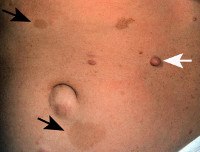 Дерматологические изменения, сопровождающие факоматоз, обычно выявляются в первые несколько месяцев жизни. Они бывают единичные или диффузные, вариабельные по цвету и величине, как правило, асимметричные. Наиболее часто встречаются пигментные пятна, участки гипопигментации, дерматофибромы, нейрофибромы, папилломы, шагреневые бляшки, ангиомы.