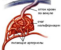 • I тип. Пучок изменённых сосудов с 1 - 2 гипертрофированными приводящими артериями и эфферентной веной. В ряде случаем отток идёт по нескольким венам. Хорошо виден на ангиограммах, кровоток замедлен.