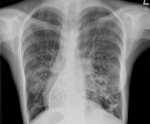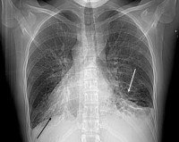• Физикальное исследование. Перкуторно выявляется смещение кардиальной тупости вправо. При аускультации лёгких выслушиваются жёсткое дыхание и обилие сухих и влажных мелко- и среднепузырчатых хрипов, которые могут исчезать после откашливания. Сердечный толчок и верхушечный тон определяются в 5-ом межрёберном промежутке справа от грудины.