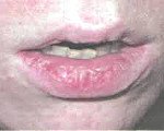 Атопический хейлит характеризуется поражением красной каймы губ и кожи вокруг нее, наиболее интенсивно проявляющимся в уголках рта. При этом слизистая оболочка полости рта никогда не вовлекается в патологический процесс. Заболевание начинается с небольшого отека губ, ощущения зуда и сухости. После этого на воспаленной поверхности красной каймы появляется четко ограниченный участок ярко-розового цвета - эритема.