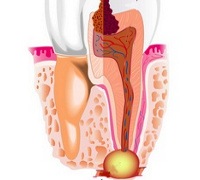 Периапикальный абсцесс развивается в результате инфицирования корневых каналов при остром периодонтите или в случае обострения хронического деструктивного процесса. К основным причинам воспаления верхушечного периодонта относят травмы, сопровождающиеся разрывом сосудисто-нервного пучка, термический перегрев пульпы в процессе препаровки витальных зубов перед протезированием, токсическое воздействие на пульпу фотополимерных материалов при глубоком кариесе.