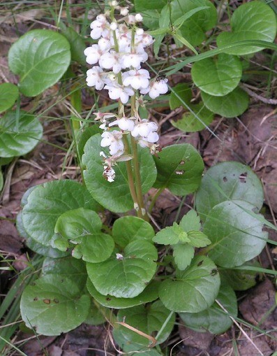 Грушанка - многолетнее растение с ветвистым и длинным корневищем, из узлов которого образуются надземные стебли и придаточные корни. Стебель у растения тонко-ребристый, высотой до 30-40 Листья кожистые, жесткие, глянцевые, округлые, овальные или яйцевидные, городчатые или цельнокрайние, сидят на черешках, собраны в розетку.
