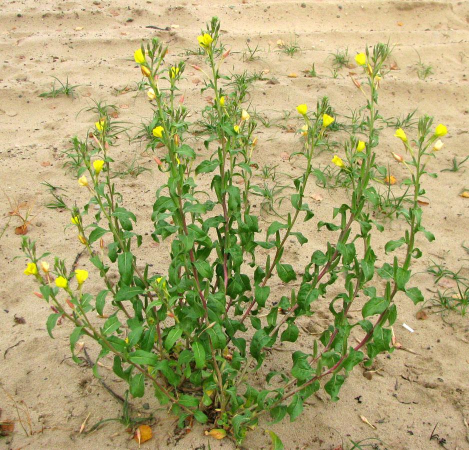 Энотера двулетняя - двухлетнее растение с мясистыми сочными корнями до 15 см длиной и до 5 см в диаметре. В первый год вегетации образуется прикорневая розетка из листьев, имеющих обратнояйцевидную форму. В процессе вегетации, преимущественно на второй год, из корневища вырастает прямостоячий стебель высотой до 2 м, на котором поочередно располагаются выемчато-зубчатые продолговато-ланцетные листья. Все растение опушено шерстистыми волосками. В пазухах верхушечных листьев энотеры расположены одиночные сидячие двуполые цветки с желтыми лепестками. Цветоложе продолговато-цилиндрическое, четырехугольное, вверху расширенное. Чашечка с длинной тонкой трубочкой и 4 ланцетными, продолговато-заостренными частями, зеленого цвета, прикреплена к верхнему краю завязи. Венчик желтый, из 4 обратнояйцевидных лепестков. Растение цветет целое лето. Цветы раскрываются после 18 часов, а закрываются утром, период цветения длится только 24 часа. Опыляют растение ночные мотыльки.