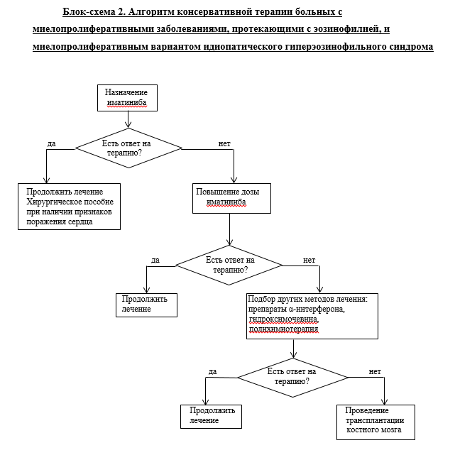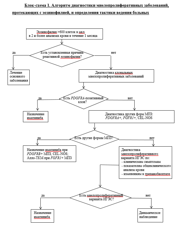 Таким образом, для установления причины ГЭС требуется комплексная диагностика с использованием различных методов исследования. ГЭС как окончательный диагноз устанавливается методом исключения, и лишь констатирует факт наличия эозинофилии и поражения органов. При этом также предполагается либо реактивная, либо опухолевая (миелопролиферативная) природа синдрома. Так, если имеется симптомокомплекс, характерный для миелопролиферативного процесса (гепатоспленомегалия, миелоцитарный сдвиг в формуле крови, миелоидная гиперплазия в костном мозге), некоторые исследователи [1, 2, 10] рассматривают данный вариант ГЭС как миелопролиферативный. По нашему мнению, выделение миелопролиферативного варианта из группы ГЭС крайне важно для выбора терапевтических подходов.