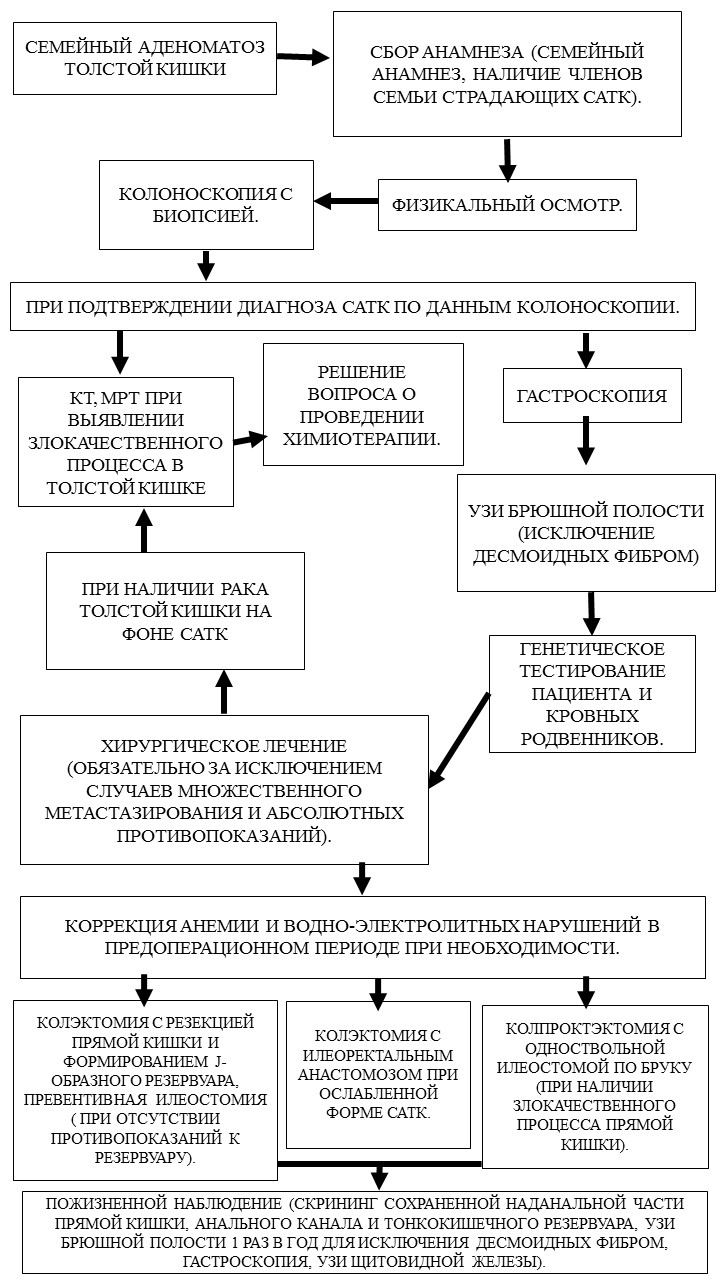 В настоящее время единственным методом лечения семейного аденоматоза толстой кишки является хирургическое вмешательство. До выделения клинических форм аденоматоза считалось, что хирургическое лечение следует предпринимать сразу после установления диагноза, вне зависимости от характера поражения толстой кишки. Однако наличие клинического полиморфизма, проявляющегося в различных сроках появления полипов и интенсивности поражения ими толстой кишки, возрастных периодов возникновения рака, поставило на повестку дня вопрос о сроках и объеме операции при каждом из вариантов развития заболевания.