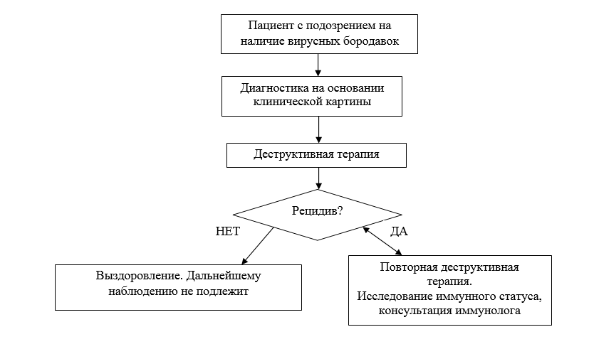 Комментарии: Ведущим направлением в лечении вирусных бородавок является деструктивная терапия. Данная методика является приоритетной, несмотря на то, что ее эффективность составляет 50-80%, а вероятность развития рецидива после регенерации тканей остается весьма высокой. Высокий риск рецидивирования отмечается при распространенных бородавках (площадью более 2 см2), при подошвенных бородавках, при бородавках с околоногтевой локализацией. При выборе метода терапии необходимо учитывать локализацию и площадь очагов поражения.