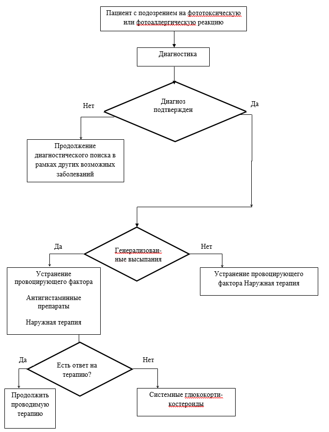Комментарии. Основным в лечении является устранение воздействия лекарственного препарата или химического вещества, вызвавшего нежелательный эффект и ограничение солнечного (ультрафиолетового) облучения.