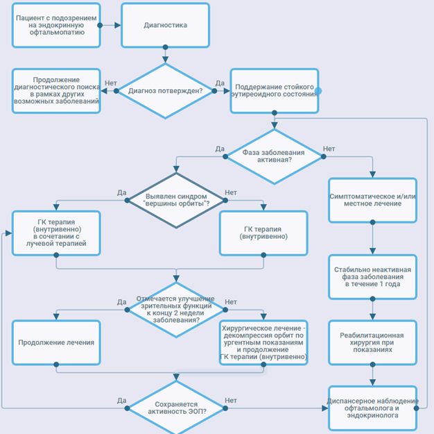 ЭОП. Мультидисциплинарная проблема, находящаяся на стыке эндокринологии и офтальмологии. В настоящее время помощь больным с ЭОП недостаточна именно вследствие плохого взаимодействия офтальмологов и эндокринологов. В России практически отсутствуют специализированные центры, где пациенты с ЭОП могут получить комплексное лечение, включая хирургическое. Поздние диагностика и обращение за квалифицированной медицинской помощью, отсутствие стойкой компенсации функциональных нарушений щитовидной железы, ошибки в определении фазы ЭОП и выборе метода ее лечения, отсутствие преемственности и согласованности между офтальмологами и эндокринологами являются причинами низкой эффективности лечения ЭОП. Отсутствие в нашей стране единых подходов к диагностике и лечению ЭОП, необходимость включить опыт международных центров по решению проблем ЭОП в отечественную практику, объединить усилия разных специалистов (эндокринологов, офтальмологов, радиологов, эндокринных хирургов, нейрохирургов) в решении проблем ЭОП явились предпосылками для создания данных рекомендаций.
