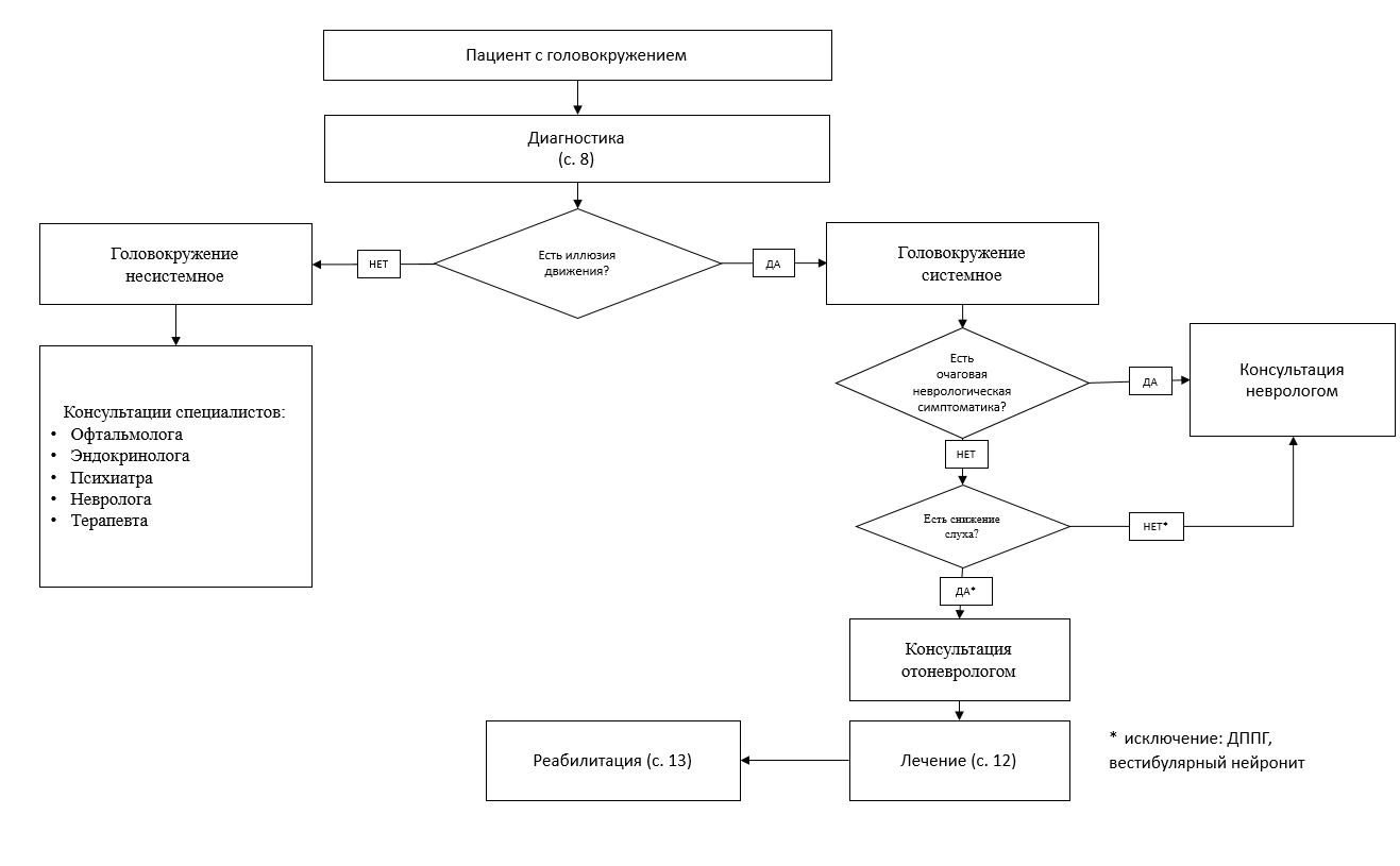 При первом обращении пациента с жалобой на головокружение он должен быть информирован о важности проведения полноценного диагностического этапа, так как головокружение может быть проявлением самых разных заболеваний. Составляется план обследования с привлечением разных специалистов на основании сбора жалоб и анамнеза заболевания.