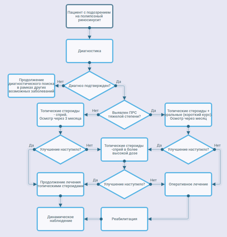 Информация для пациентов.В лечении ПРС используют как медикаментозные, так и хирургические методы. Согласно современным согласительным документам, к лечению ПРС (за исключением одностороннего) следует подходить с терапевтических, а не с хирургических позиций. В большинстве случаев используется комплексный подход. Это обусловлено тем, что большая часть пациентов обращается к оториноларингологу при наличии уже обтурирующих полипов и стойкой назальной обструкции, когда медикаментозная терапия не может оказать выраженного лечебного эффекта. В то же время односторонний полипозный процесс является показанием к хирургическому лечению, нередко требующим коррекции внутриносовых аномалий и вмешательства в пределах одной пораженной пазухи. При адекватно проведенной операции такое заболевание обычно не рецидивирует.