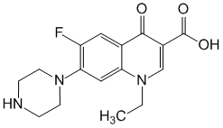 1-Этил-6-фтор-1,4-дигидро-4-оксо-7-(1-пиперазинил)-3-хинолинкарбоновая кислота (и в виде гидрохлорида).