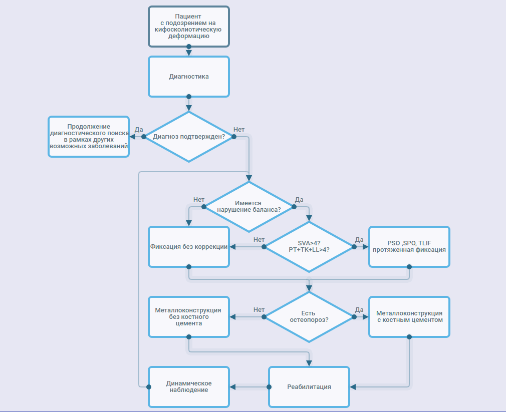 Статистически детерминированными прогностическими факторами прогрессирования деформации являются искривление позвоночного столба >30° по сobb, ротация позвонка на вершине деформации более II степени, латеролистез >6 а также прохождение линии, соединяющей гребни подвздошных костей, ниже уровня L4 позвонка (Pritchett J.W., вortel D.T., 1993; Yadla S. et al., 2010). Причем нарастание деформации ведет не только к фронтальным нарушениям, но и, в первую очередь, к сагиттальному дисбалансу с формированием плоской спины (Aebi M., 2005). Такие важные у детей и подростков со сколиозами факторы, как возраст и пол, не оказывают влияния на прогрессирование деформации в этой категории больных.