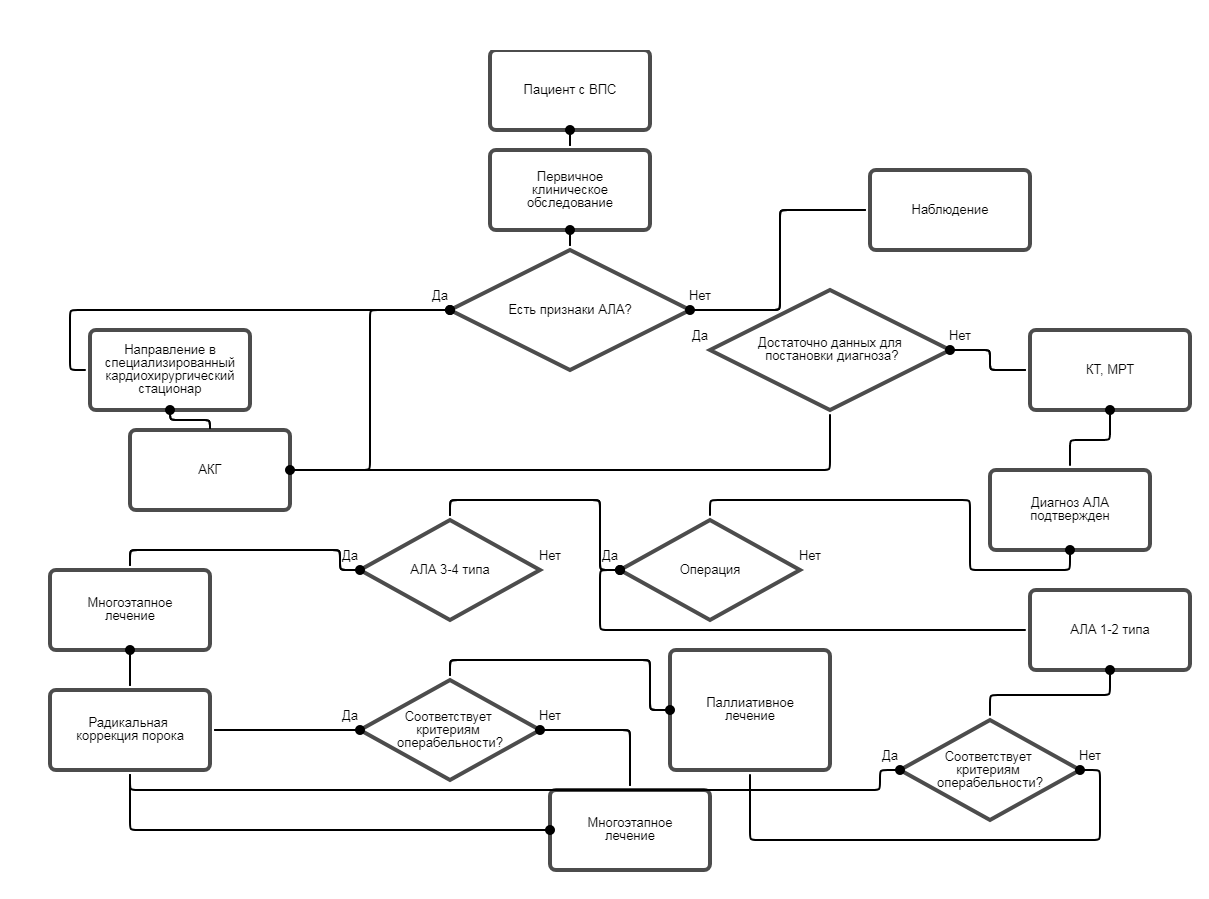 Информация для пациента.Атрезия легочной артерии представляет собой врожденное отсутствие прямого сообщения междуправым желудочком и системой легочной артерии.Это довольно редкий ВПС, который отмечается в 2-3% случаев от всех ВПС. Порок встречается как в виде сочетания с ДМЖП, так и с различными сложными ВПС, такими как транспозиция магистральных сосудов, атрезия правого атриовентрикулярного отверстия, единственный желудочек сердца Анатомические критерии порока следующие: 1) отсутствие ЛА на различных уровнях; 2) большой ДМЖП; 3) наличие дополнительных источников коллатерального кровотока легких; 4) гипертрофия ПЖ; 5) декстропозиция корня аорты; 6) нормальное взаимоотношение аорты и ствола ЛА. при этом состояние ребенка, в основном, зависит от величины ОАП, наличия больших аорто-легочных коллатеральных артерий. Нарушения гемодинамики при данном пороке определяются главным образом отсутствием прямого сообщения между ПЖ и системой ЛА, при этом прямое поступление венозной крови из ПЖ невозможно. Кровоток в легких осуществляется обходным путем из ПЖ через ДМЖП в ЛЖ, далее смешанная артериализированная кровь поступает в аорту и лишь затем через ОАП или по коллатеральным сосудам в легкие. При этом насыщение крови кислородом в аорте, коллатеральных артериях и легочной артерии идентично. Прогноз жизни пациента зависит от характера легочного кровотока. Смертность детей с дуктус-зависимой гемодинамикой до 12 месяцев составляет 90%. У пациентов, имеющих несколько источников легочного кровотока и умеренно выраженный цианоз к 3-5 летнему возрасту смертность составляет 50%. При усиленном легочном кровотоке и наличии больших аорто-легочных коллатеральных артерий пациенты умирают по мере развития легочной гипертензии преимущественно в третьей декаде жизни. В целом медиана выживаемости пациентов с АЛА и ДМЖП находится в пределах 6 мес. 2 лет.