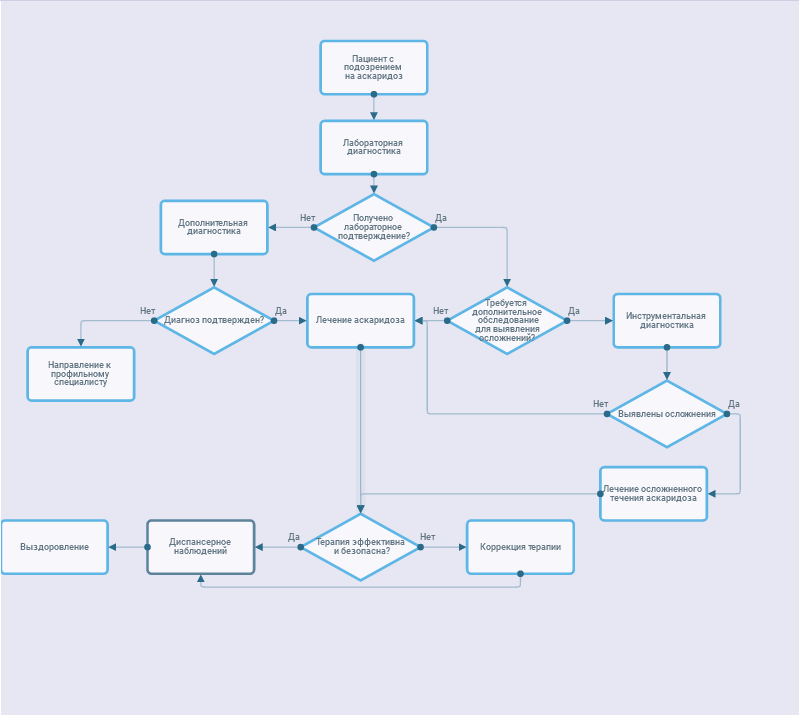 Диагноз «аскаридоз» устанавливается только при положительных результатах паразитологического исследования. Положительный результат серологического теста не является основанием для подтверждения диагноза «аскаридоз» и назначения антигельминтной терапии.