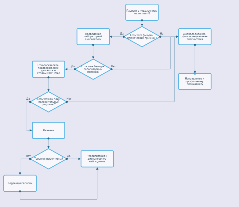 | Биохимический анализ крови (АЛТ, АСТ, билирубин) через 10 дней после выписки из стационара, далее: при гладком течении - через 1, 3, 6 мес. при сохранении клиниколабораторных признаков - наблюдение до 12 мес. HBsAg, анти-HBs- через 1, 3, 6 мес. При сохранении HBsAgпроводят определение HBeAg, анти-НВе и ДНК HBV | Медицинский отвод от вакцинации при: • легкой и средней - 1-3 мес. • тяжелой - 6мес. Медицинский отвод от занятий спортом - 3-6 мес. Ограничение инсоляции до 12 мес. | Отсутствие рецидива заболевания. Отсутствие прогредиентного и хронического течения заболевания. | Клиническое выздоровление и полная нормализация биохимических показателей. |