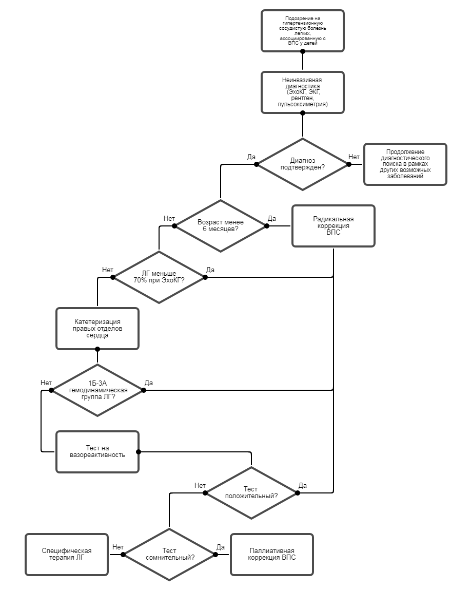Патогенез и клиническое течение «идиопатической легочной артериальной гипертензии (иЛАГ) в сочетании с ВПС» схожи с идиопатической ЛАГ [7, 13, 14]. Закрытие дефектов перегородок сердца при «иЛАГ в сочетании с ВПС» противопоказано.