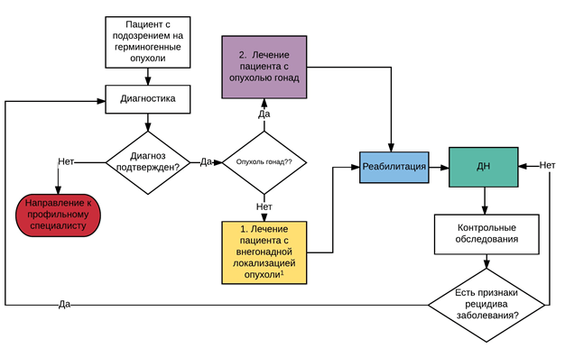 Подходы к лечению этих заболеваний несколько отличаются: при локализациях в гонадах - на первом этапе показано хирургическое лечение, при внегонадных локализациях - лечение начинают с химиотерапии.