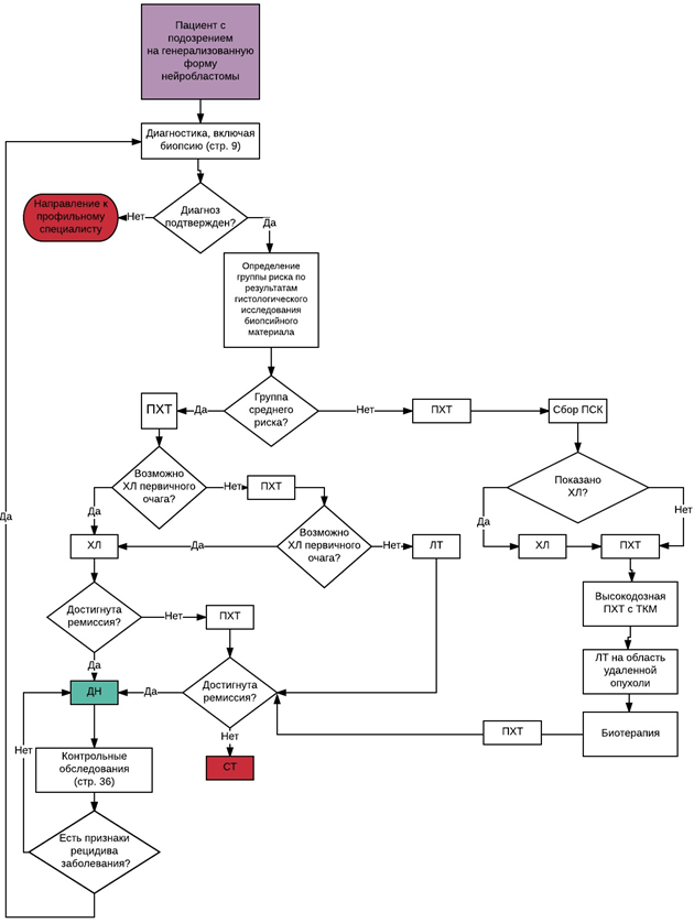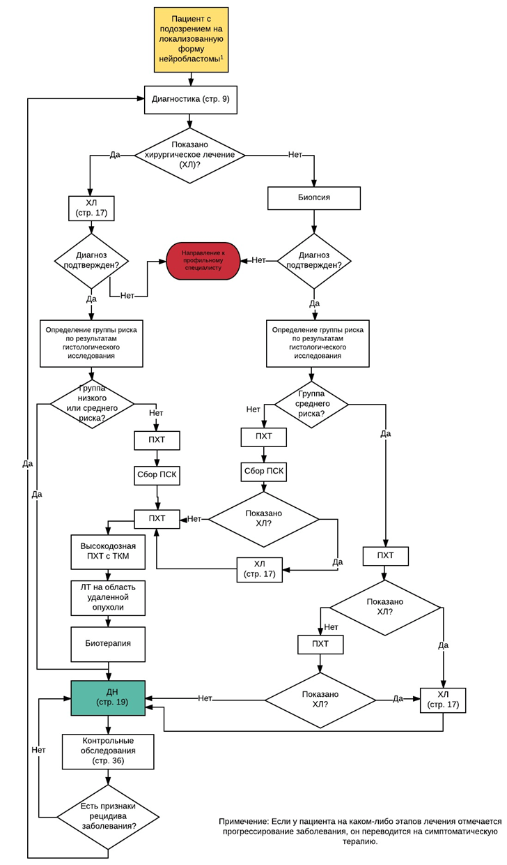 После получения всех результатов обследования, будет установлена стадия заболевания и группа риска и определен план ведения ребенка. Тактика лечения зависит от группы риска. Группа риска определяется возрастом, характеристиками опухоли (гистология и генетика) и стадией (степень распространения заболевания). В настоящее время выделяют три группы риска: группа низкого риска (наблюдения), группы промежуточного и высокого риска.
