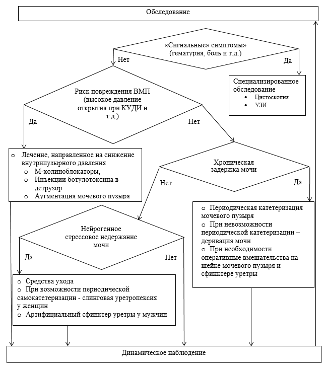 НДНМП может сопровождаться развитием осложнений, наиболее опасным из которых является нарушение функции почек. Поскольку выраженность симптомов не коррелирует с вероятностью развития отдаленных осложнений [4], необходимо выявлять пациентов с нейрогенной дисфункцией и определять группы с высокой степенью риска развития осложнений (высокая/низкая). Риск повреждения верхних мочевых путей (ВМП) и почечной недостаточности намного ниже у пациентов с медленно прогрессирующей патологией нетравматической этиологии, чем у больных с травмой спинной мозга или spina bifida [5]. Тактика лечения и схема наблюдения зависят от типа нейрогенной дисфункции и основной причины ее развития.