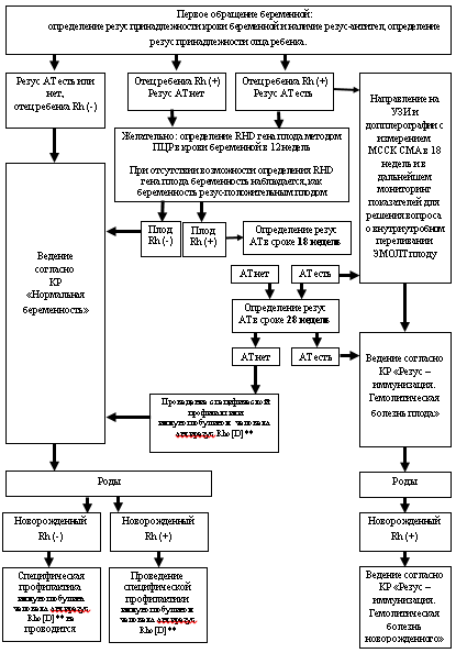 Комментарии. Если профилактика резус-изоиммунизации проводится позже 28 недель беременности, то определение анти-Rh-антител проводится перед введением иммуноглобулина человека антирезус Rho[D]** [8]. Более частое определение анти-Rh-антител нецелесообразно. Следует определить резус-фактор мужа/партнера. При резус-отрицательной принадлежности крови мужа/партнера определение антирезусных антител не проводится. При неизвестной или резус-положительной принадлежности крови мужа/партнера беременной женщине желательно провести неинвазивное определение резус-фактора плода по циркулирующим в крови матери внеклеточным фрагментам плодовой ДНК, которое имеет чувствительность и специфичность 98-100%. Это исследование можно рекомендовать в сроке 12 недель беременности во время проведения первого пренатального скрининга. При определении резус-отрицательной принадлежности крови у плода определение антирезусных антител в крови матери не проводится. При отсутствии возможности определения резус-генотипа плода беременность наблюдается как беременность резус-положительным плодом. В европейской популяции преобладает полная делеция гена RhD, что и позволяет выявлять ген RhD плода в кровотоке матери при отсутствии материнского гена. Однако, у 3-5% резус-отрицательных европейцев ген RhD обнаруживается либо полностью, либо как возникший вследствие генной конверсии между экзонами генов RhD и RhCE (гибридные гены RhD-CE-D). Такие гибридные гены не способны кодировать синтез антигена D на поверхности мембраны эритроцитов. В этом случае имеет место расхождение между фенотипической и генотипической резус-принадлежностью. Наличие RhD гена у матери мешает выявлению RhD гена плода. При выявлении RhD гена у матери неинвазивное определение резус-принадлежности плода невозможно, и такая беременность должна быть проведена как беременность резус-положительным плодом.