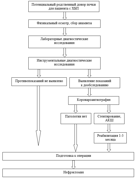 Ввиду того, что прижизненным донором почки выступает практически здоровый человек, до момента проведения нефрэктомии состояние не является патологическим и не имеет клинической картины. Основной целью процесса обследования потенциальных доноров является оценка пригодности донора и минимизация потенциального риска здоровью донора. Это включает выявление противопоказаний к донорству и потенциальных клинических (физических и психосоциальных) рисков. Донорами могут стать лица старше 18 лет, прошедшие полное медицинское обследование, давшие информированное добровольное согласие на проведение нефрэктомии. Изъятие почки у живого донора для трансплантации допустимо только в случае, если по заключению врачебной комиссии медицинской организации с привлечением соответствующих врачей-специалистов, оформленному в виде протокола, его здоровью не будет причинен значительный вред [2, 6].