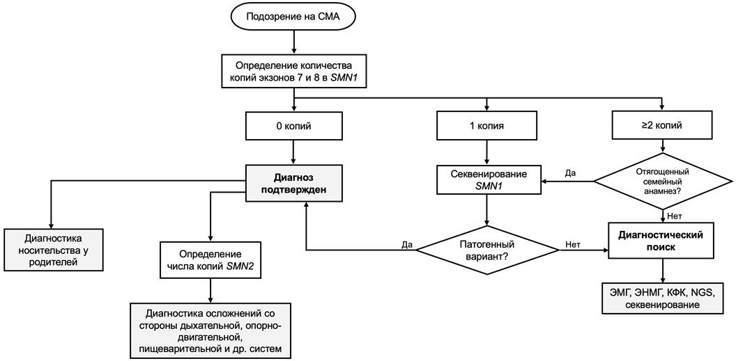 Необходимо отметить, что определение типа СМА проводится не на основании числа копий гена SMN2, а с учётом особенностей течения заболевания и клинической картины у конкретного пациента в совокупности с данными молекулярно-генетического тестирования.