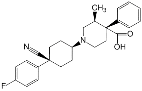 (-)-[1(цис),3альфа,4бета]-1-[4-Циано-4-(4-фторфенил)циклогексил]-3- метил-4-фенил-4-пиперидинкарбоновая кислота (и виде гидрохлорида).