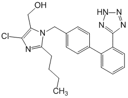 Лозартан (в виде лозаратана калия) представляет собой сыпучий кристаллический порошок от белого до почти белого цвета с молекулярной массой 461,01. Он легко растворим в воде, растворим в спиртах и слабо растворим в обычных органических растворителях, таких как ацетонитрил и метилэтилкетон. Окисление 5-гидроксиметильной группы имидазольного кольца приводит к образованию активного метаболита лозартана.