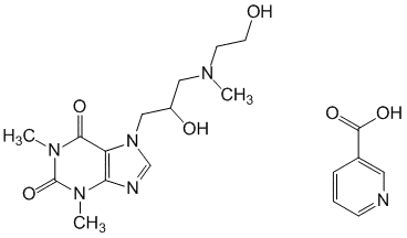 3,7-Дигидро-7-[2-гидрокси-3-[(2-гидроксиэтил)метиламино]пропил]-1,3-ди метил-1H-пурин-2,6-дион с никотиновой кислотой.