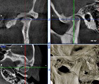 CBCT TMJ. Это метод лучевой диагностики, целью которого является исследование височно-нижнечелюстного сустава. Это исследование позволяет визуализировать следующие анатомические структуры: голова и верхняя часть нижней челюсти, нижнечелюстная ямка височной кости, суставное пространство и прилегающие костные структуры верхней челюсти. TMC сBCT дает возможность выявить следующие патологические изменения: травматическое повреждение кости, смещение суставных поверхностей, аномалии развития, дегенеративно-дистрофические процессы и новообразования. сBCT TMJ обычно выполняется без улучшения контраста. Для увеличения содержания информации сканирование выполняется в двух функциональных положениях: рот открыт и максимально открыт.