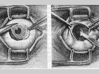 Потрошение глазного яблока. Это хирургическое вмешательство, целью которого является удаление роговицы и внутриглазного содержимого, поддержание склеры и экстраокулярных мышц. Хирургическая тактика применяется при слепоте с сопутствующей болью, панофтальмитом и гнойным эндофтальмитом. Потрошение требует последовательной круговой перитомии и склерэктомии. После удаления содержимого глаза и резекции заднего полюса склеры вводится орбитальный имплантат и послеоперационная рана ушивается. Чтобы стабилизировать верхнюю и нижнюю арки, под веками ставят конфронтацию и, в конце, накладывают повязку. Потрошение глазного яблока может быть осложнено частичным склерозом, вывихом век и атрофией жировой орбитальной ткани.