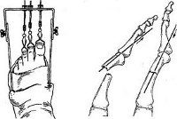 Процедура проводится под местной анестезией. Гипсовая повязка наносится на поврежденный сегмент (для травмы нижней конечности - лодыжки и стопы, травмы верхней конечности - нижней трети предплечья и запястья). Прикрепите бандажную проволоку к повязке несколькими витками гипсовой повязки так, чтобы их дистальная часть находилась на расстоянии 8-10 см от пальцев руки или ноги. Присоедините пружинный или резиновый шланг к дуге. Через боковые поверхности ногтевой фаланги стопы или кисти с помощью толстой иглы проводится шелковая нить, которая затем прикрепляется к пружине (резиновая трубка).