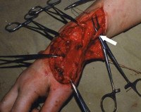 • Сухожилие в напряжении. В случае нарушения ее целостности, мышца сокращается и часто уменьшает центральный конец сухожилия на значительное расстояние от места повреждения. Эта особенность особенно выражена при наличии повреждения сгибателей. Часто, когда целостность сгибателя нарушается на уровне средней или основной фаланги пальца, его центральный конец находится в ладони, а иногда и в области запястья.