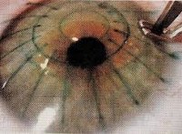 Радиальная Кератотомия. Это микрохирургический метод коррекции зрительных функций. Хирургическое вмешательство показано при близорукой рефракции, астигматизме, кератоконусе и аномалии роговицы. Операция проводится под регионарной анестезией. После обозначения зрачка, оптической зоны и места будущих разрезов врач использует алмазный нож для выполнения радиальных разрезов на роговице. Из-за внутриглазного давления роговица слегка меняет конфигурацию, что влечет за собой изменение ее преломляющей способности. Результатом радиальной кератотомии является коррекция дисфункции зрения. В послеоперационном периоде могут возникнуть гиперметропические изменения, вторичный астигматизм, истончение и перфорация роговицы.
