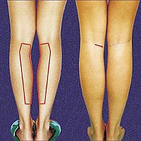 При легкой О-образной и ложной кривизне ног, а также при небольших объемах икроножных мышц выполняется эндопротезирование - установка силиконового имплантата под икроножные мышцы. Разрез для установки имплантата выполняется в области подколенной ямки, а сам эндопротез помещается в полость между икроножными мышцами, что препятствует его миграции. Рубец, расположенный под коленом в естественной складке, после заживления практически не виден окружающим. Этот тип восстановления голени выполняется под общим наркозом и длится около 1 часа.Для протезирования имплантатов используются исключительно силиконовые имплантаты с грубой или гладкой текстурой. Имплантаты для ног подбираются индивидуально, с учетом анатомических параметров ног конкретного пациента. При наличии начальной асимметрии ног эндопротезирование можно проводить только на одной ноге.